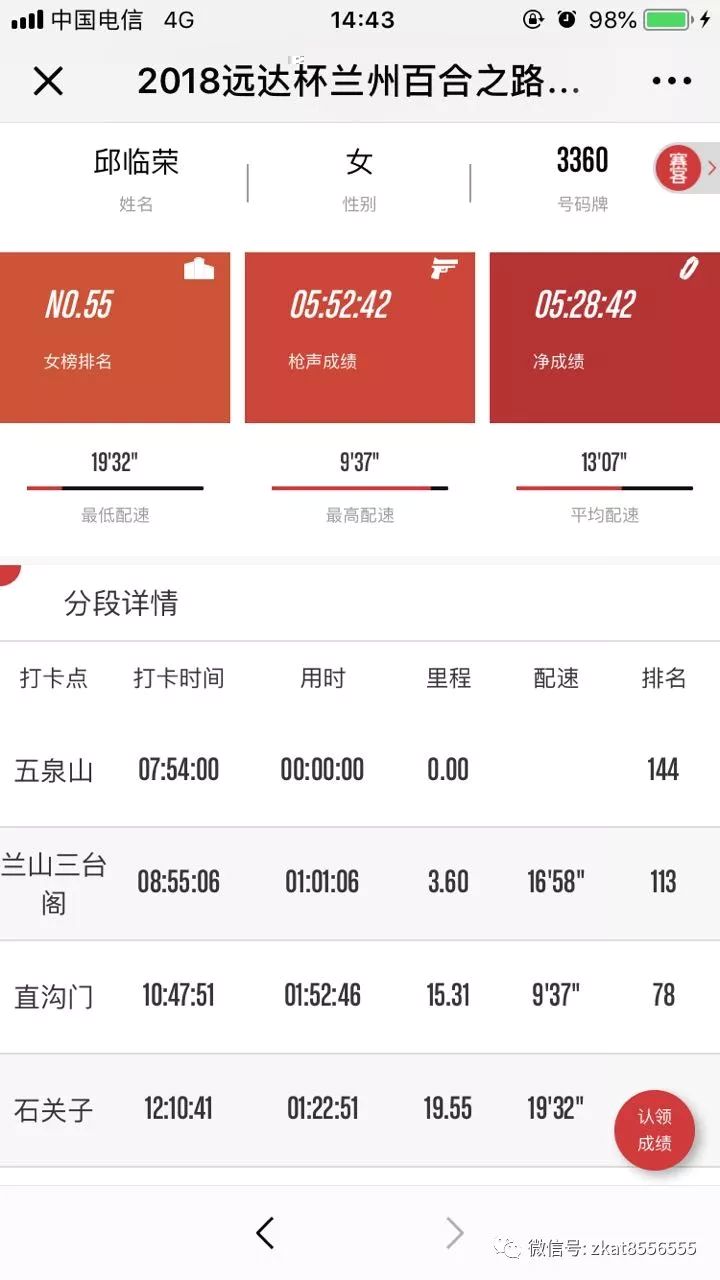 在当天结束的25公里组比赛中,身背3360号,来自甘肃临夏的女孩邱临荣以5小时52分42秒的成绩取得了女子组第55名的不错成绩,她也是兰州分离科学研究所旗下兰州公海555000分析科技有限责任公司生产部的一名员工。